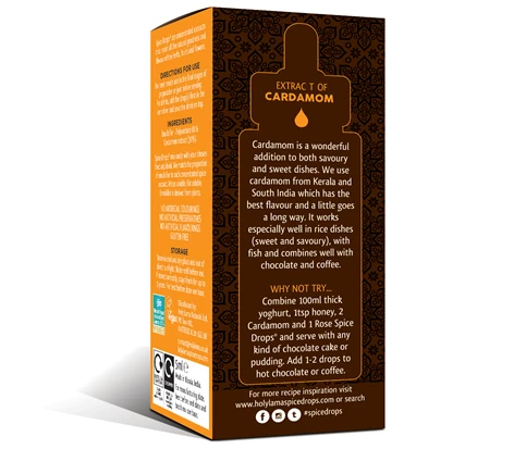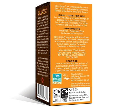 Spice Drops are concentrated extracts that retain all the natural goodness and authentic flavour of the herbs, fruits and flowers. Water and fat soluble, they mix easily with your chosen food or drink. Their emulsifier is derived from plants.