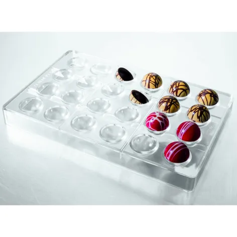 A half sphere praline mould which will make 24 chocolates, each one 30mm diameter and 18mm deep. This is one of our most popular mould designs as chocolatiers love to decorate them with all sorts of colour effects! To see our range of colours, click here.