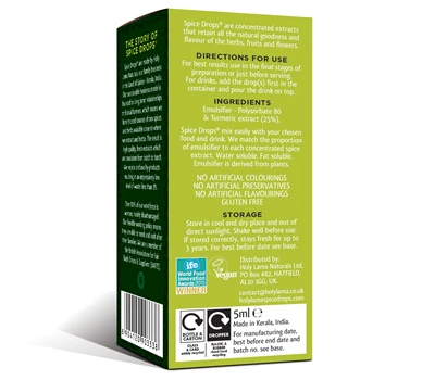 Spice Drops are concentrated extracts that retain all the natural goodness and authentic flavour of the herbs, fruits and flowers. Water and fat soluble, they mix easily with your chosen food or drink. Their emulsifier is derived from plants.