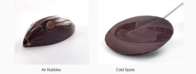 If you have insufficient crystals or too many crystals in your finished product, you will experience problems when unmoulding and potentially defects in your chocolates too. Defects can include air bubbles which create gaps in your finished chocolates, chocolates which are difficult to unmould and a dull, uneven surface.