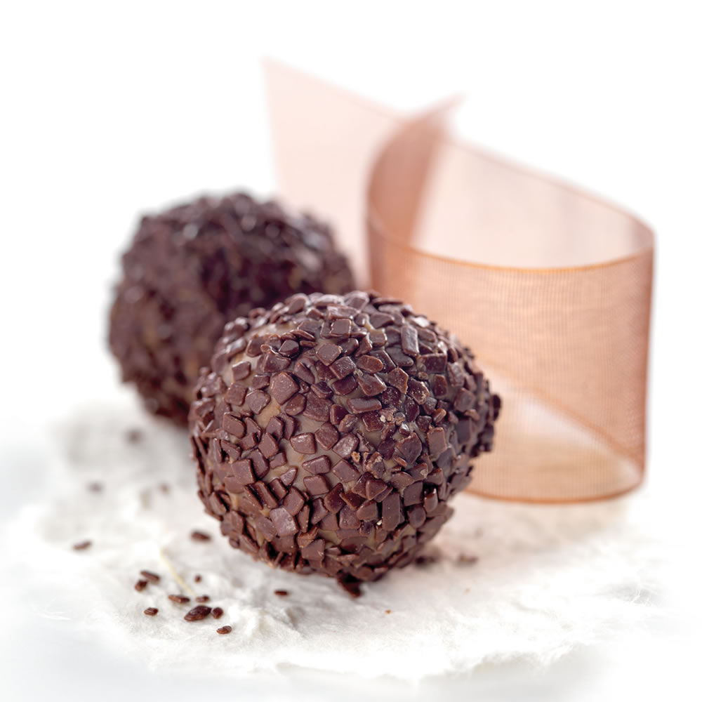 - Once set enrobe with milk chocolate and roll in chocolate splitters.
